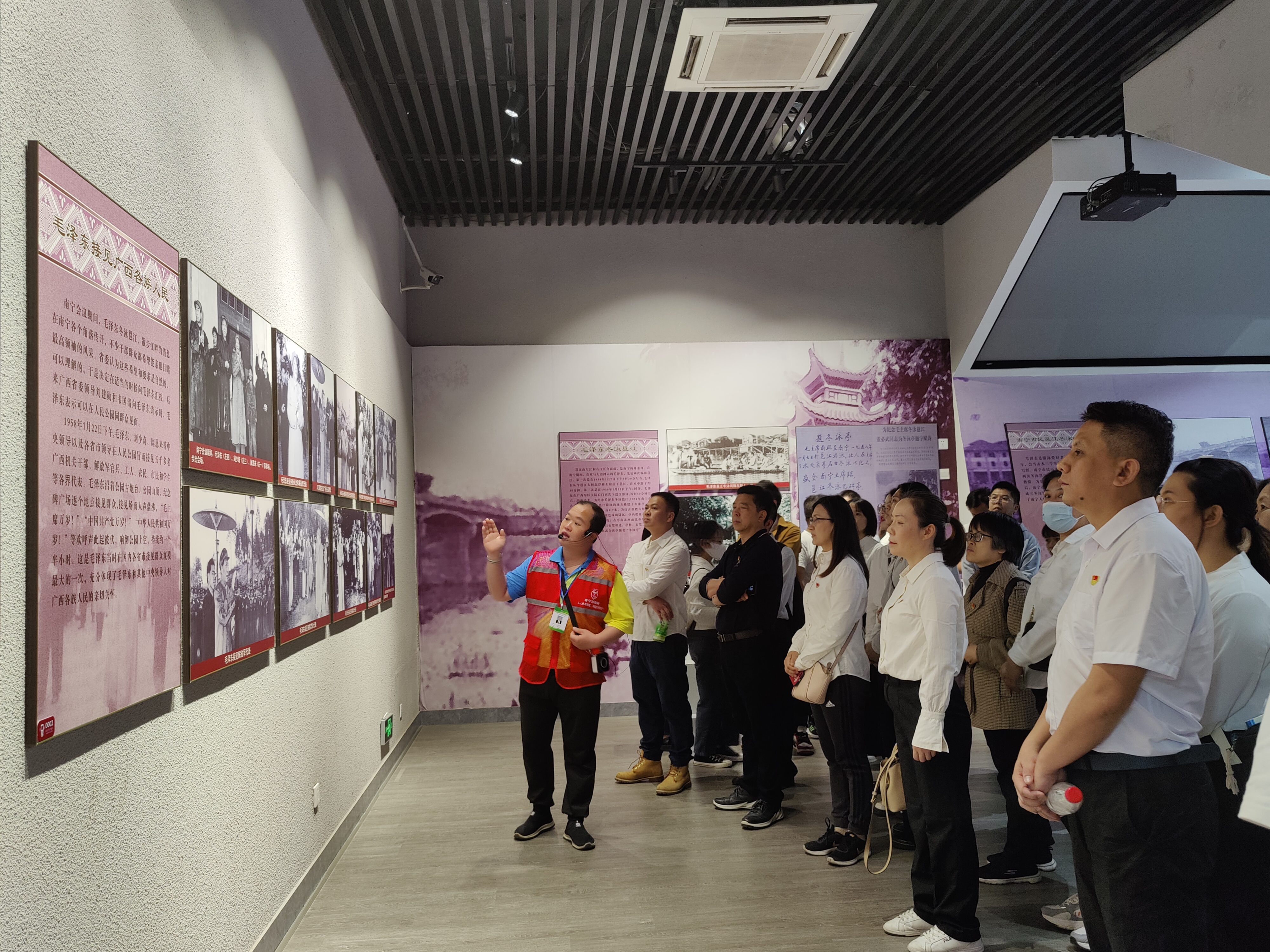 “我志愿加入中國共產(chǎn)黨……隨時準(zhǔn)備為黨和人民犧牲一切,永不叛黨?!痹诿飨右姀V西各族人民紀(jì)念館,全體人員在領(lǐng)誓人的帶領(lǐng)下舉起右拳,面對鮮紅的黨旗作出莊嚴(yán)宣誓。隨后在紀(jì)念館講解員引導(dǎo)下,通過一張張照片,一件件實(shí)物,見證毛主席對廣西各族人民的親切關(guān)懷。