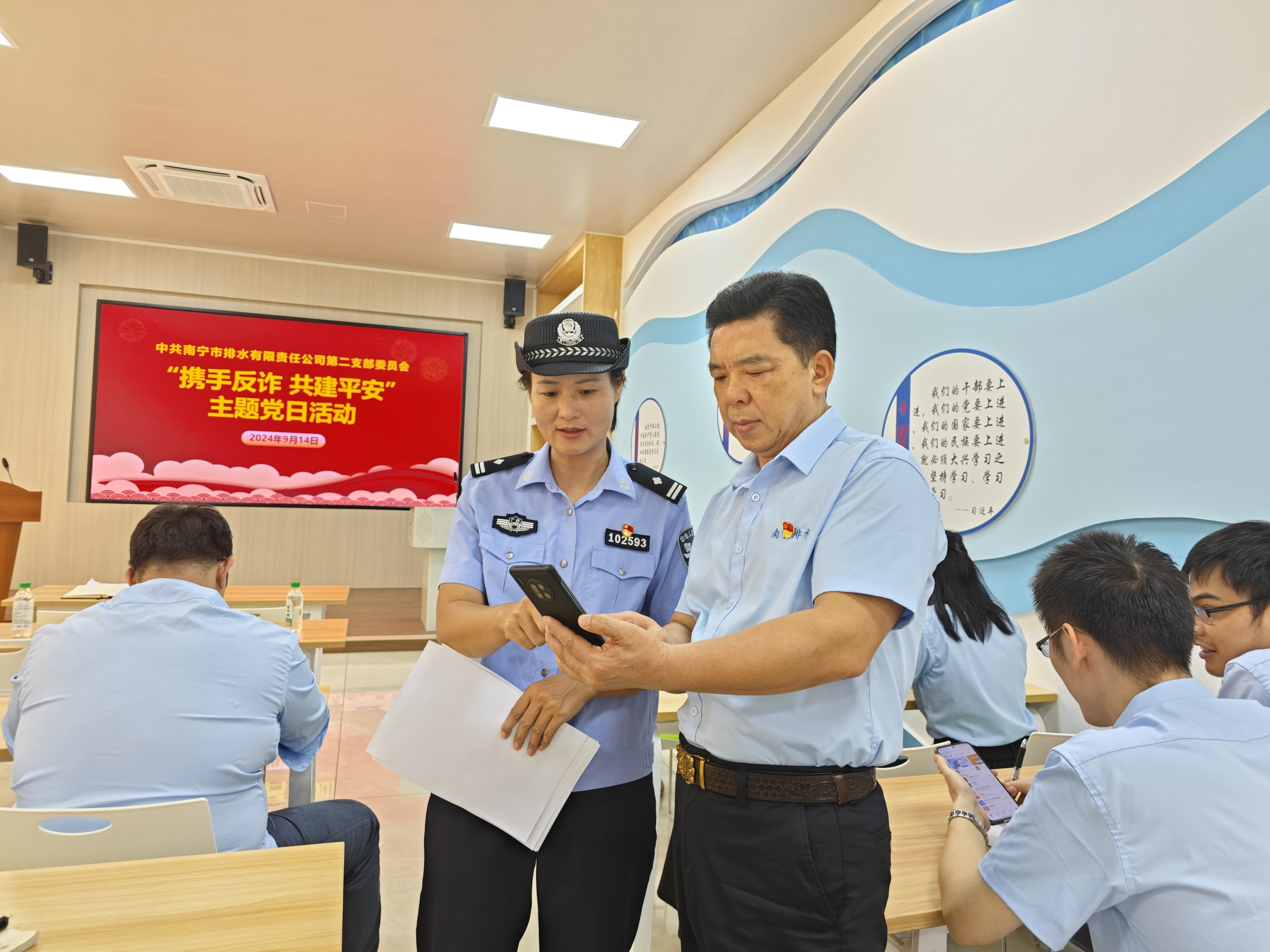 為進(jìn)一步提高黨員群眾對(duì)詐騙新手法的警惕性,積極引導(dǎo)黨員群眾主動(dòng)增強(qiáng)維護(hù)社會(huì)公德的意識(shí),9月14日,市排水公司第二黨支部在集團(tuán)公司新時(shí)代文明實(shí)踐所新時(shí)代學(xué)習(xí)大講堂,開展了“攜手反詐 共建平安”主題黨日活動(dòng)?;顒?dòng)邀請(qǐng)南寧市公安局福建園派出所民警梁警官進(jìn)行防范電信網(wǎng)絡(luò)詐騙宣傳,市排水公司黨員群眾約50人參加活動(dòng)。
