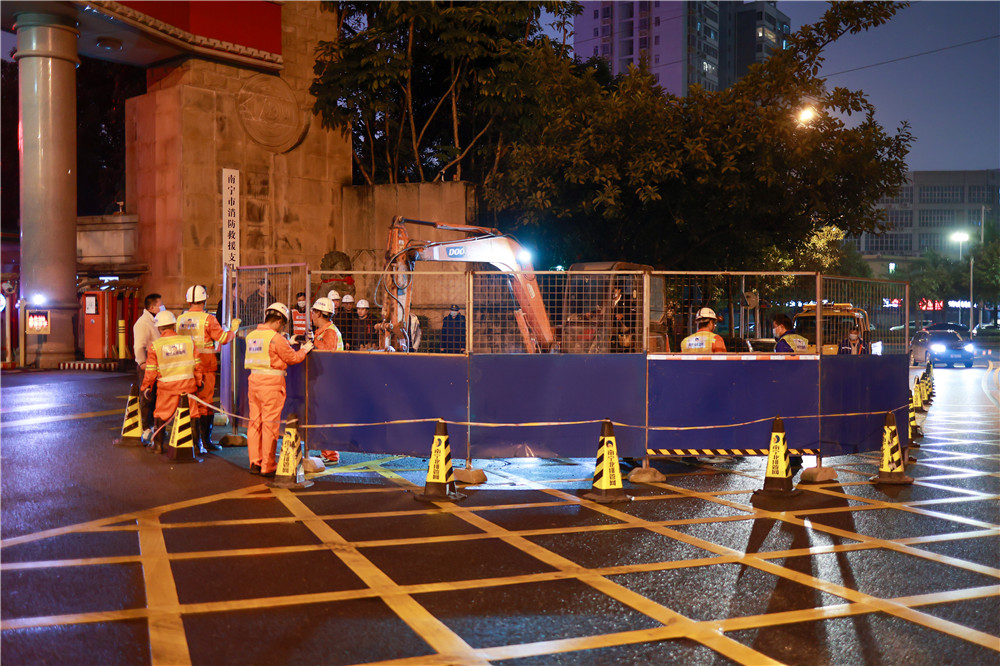 排水公司立即啟動應急預案,市住建局副局長吳智、公司副總經(jīng)理程樂坐鎮(zhèn)指揮,運維分公司經(jīng)理韋雄飛及有關(guān)負責人立即趕赴現(xiàn)場排查,核實為消防支隊用戶管破損,水流沖刷土體導致路面塌陷。當天20時,塌陷處完成圍擋,21時所有人員、車輛和設備全部到位,立即投入緊張地搶修。