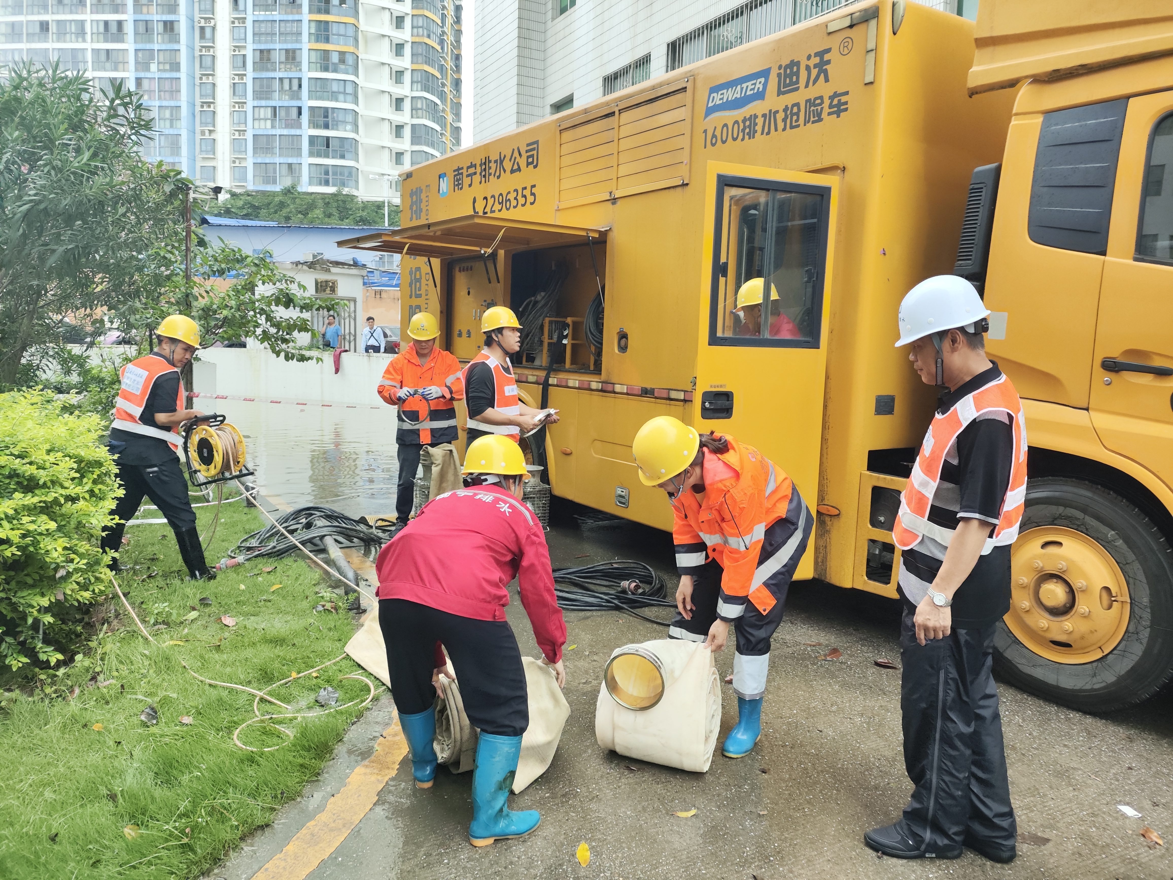 市排水公司搶險(xiǎn)隊(duì)伍前往東葛路廣西中醫(yī)藥研究院開(kāi)展排澇搶險(xiǎn)。(李正超/攝)