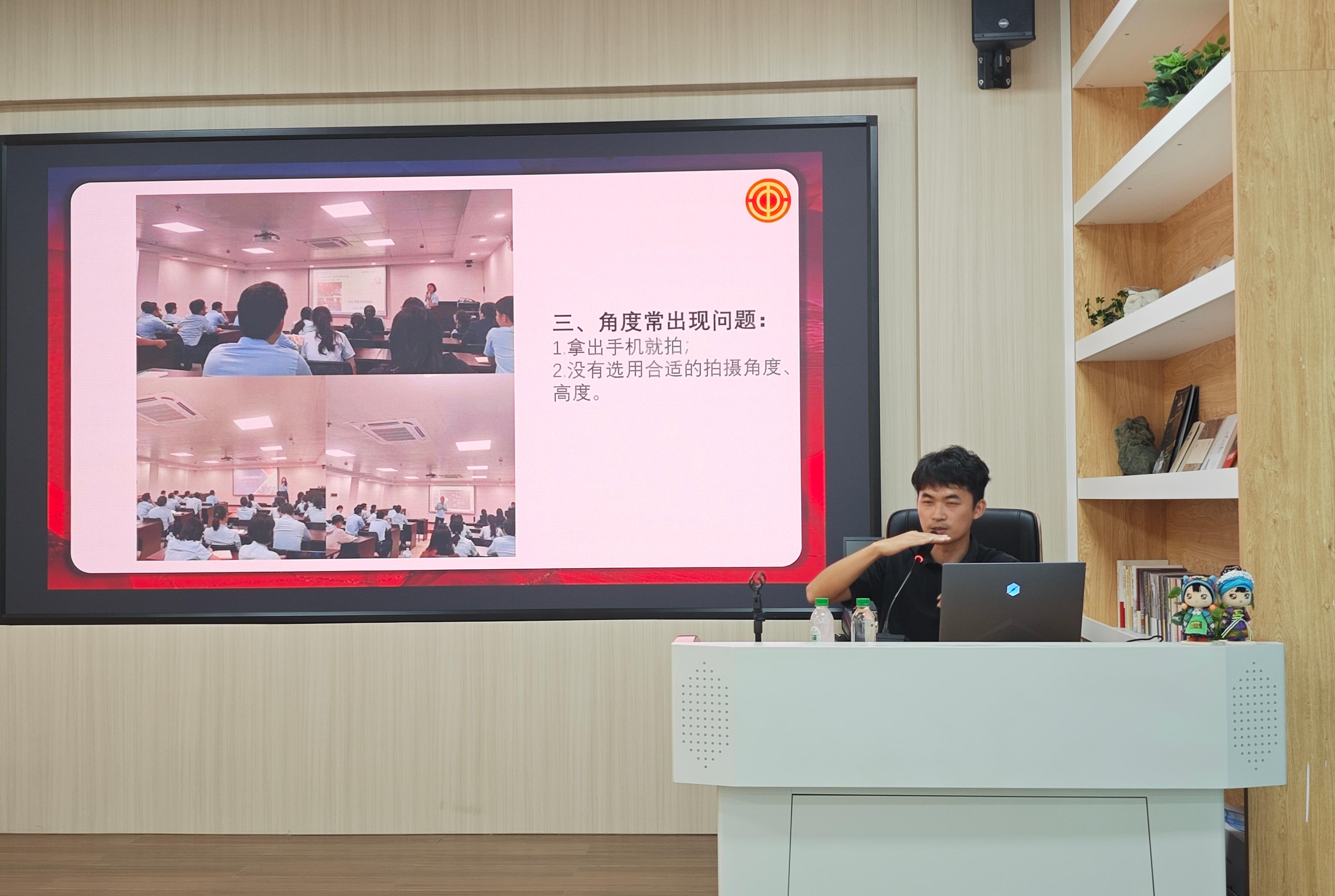 本次講座特別邀請(qǐng)了南寧市職工攝影協(xié)會(huì)副主席曾德威主講。曾老師圍繞品牌宣傳的重要性、新聞故事的挖掘、AI文案創(chuàng)作工具的應(yīng)用、手機(jī)攝影技巧以及如何捕捉并記錄珍貴瞬間等多個(gè)方面,為到場(chǎng)員工帶來(lái)了深入淺出的講解與實(shí)踐技巧的分享。他著重介紹了當(dāng)前AI技術(shù)在文案創(chuàng)作中的應(yīng)用,鼓勵(lì)大家緊跟時(shí)代步伐,充分利用現(xiàn)代科技手段提高寫(xiě)作效率與質(zhì)量。在手機(jī)攝影技巧教學(xué)環(huán)節(jié),曾老師結(jié)合實(shí)際案例,詳細(xì)講解了新聞攝影的關(guān)鍵要素和拍攝時(shí)需注意的構(gòu)圖技巧、光線運(yùn)用、拍攝站位,以及常見(jiàn)拍攝場(chǎng)地主題的應(yīng)用等攝影要領(lǐng)。